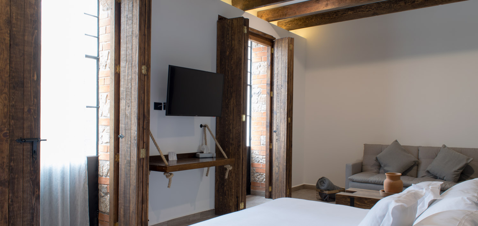 Nuestra Master Suite, es una habitación con una sala de estar con sofá/cama, diseñada para crear una experiencia de descanso total con luces led cálidas y tenues, gran amplitud y techos altos que permiten un ambiente relajado. Nuestra Master Suite cuenta con salida a dos balcones y vistas al Centro Histórico de nuestra hermosa ciudad colonial.